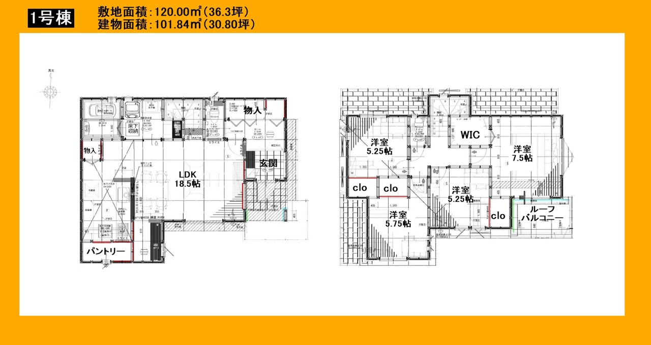 | 土地面積 | 120m² ~ 144m² 公簿 (協定部分5号棟7.70平米・6号棟7.70平米・7号棟14.01平米含む) | ||